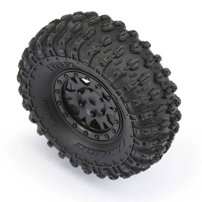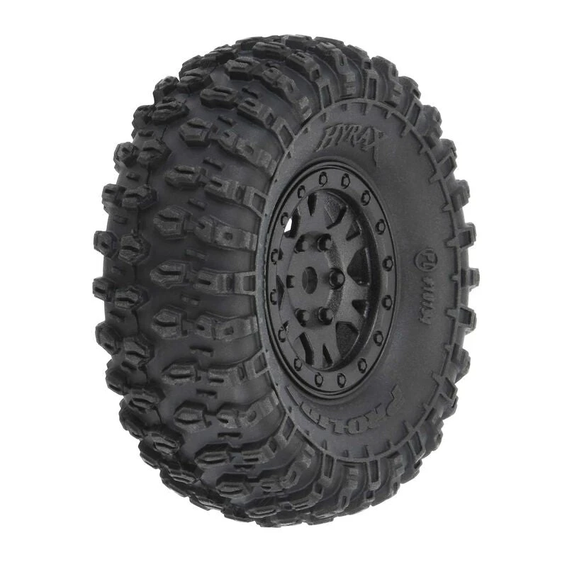 PRO1019410 | Hyrax 1.0″ Tires Mounted on Mini Impulse Black Internal Bead-Loc 7mm Hex Wheels (4) for SCX24™ Front or Rear