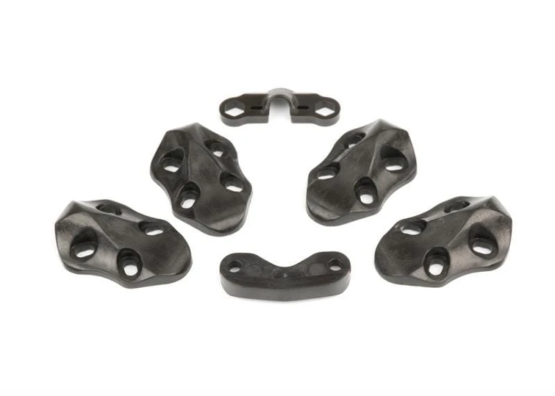 Symmetrical arms make it possible to pocket one side of the part without introducing the need for distinct left and right arms, making you require more spare parts. We use a pocket instead of a hole under the motor to increase durability and we embed a press nut to simplify attachment and avoid clearance issues under your stack.
