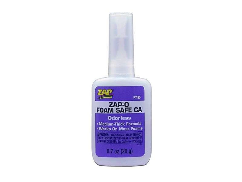 Zap-O Foam Safe CA is a true odorless CA. It has the same gap filling properties as Zap-A-Gap CA+ but without the fumes. It works great on balsa, plywood, bass wood and most other modeling and hobby materials. Zap-O Foam Safe CA is also great for craft work when gluing foam shapes or various materials to foam products. Medium thick formula that cures in 15 seconds. Packaged in a 20-gram bottle.